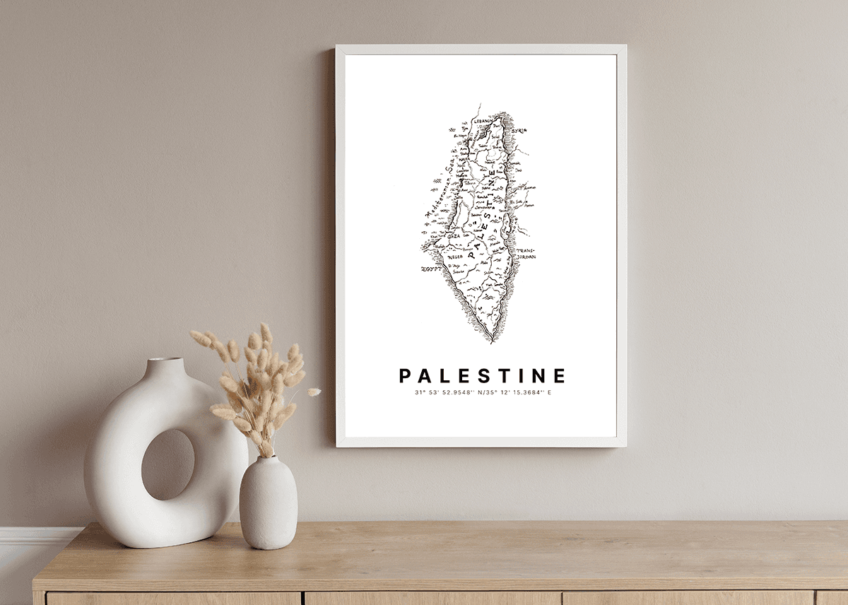 Peta Palestine digambar dengan tinta (manual) adaptasi dari peta Palestina yang termuat dalam National Geographic tahun 1947. Memberikan kesan minimalis pada sudut ruangan.